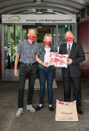 Strahlende Gesichter und viel Zuversicht bei der Arbeits- und Wohngemeinschaft Borna, Rothrist bei der Übergabe von 300 textilen Mund-Nasen-Schutzmasken durch George Lazar, Geschäftsführer von MEWA Wynau an Christine Lerch, Gesamtleiterin Borna und Manfred Trummer, Bereichsleiter Werkstatt.